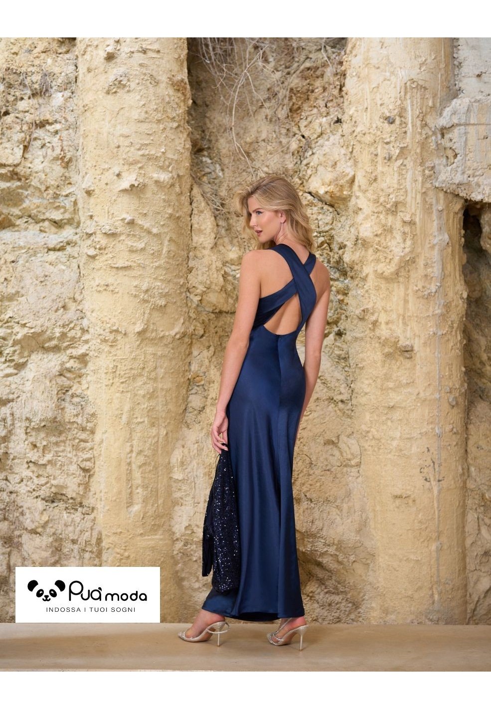Abito lungo da cerimonia in raso con spacco e scollo a V impreziosito da glitter. Linea slim elegante e femminile, perfetto per valorizzare la silhouette. 100% made in Italy.